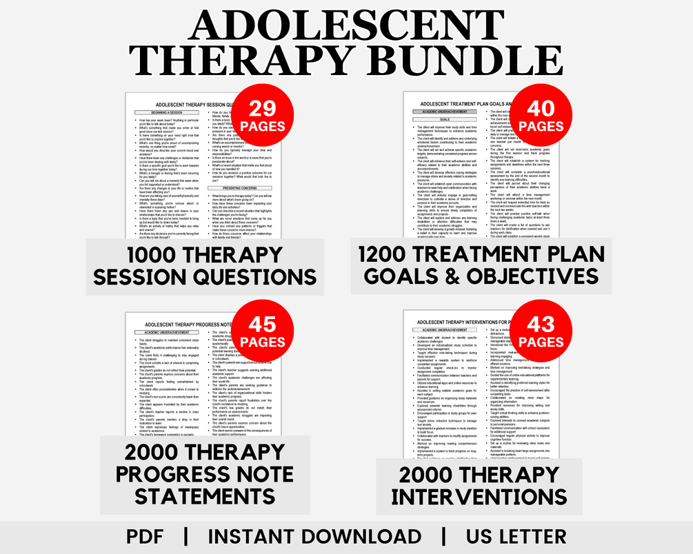 Adolescent Therapy Bundle, Therapy Questions, Therapy Goals and Objectives, Therapy Statements, Therapy Interventions, Progress Notes