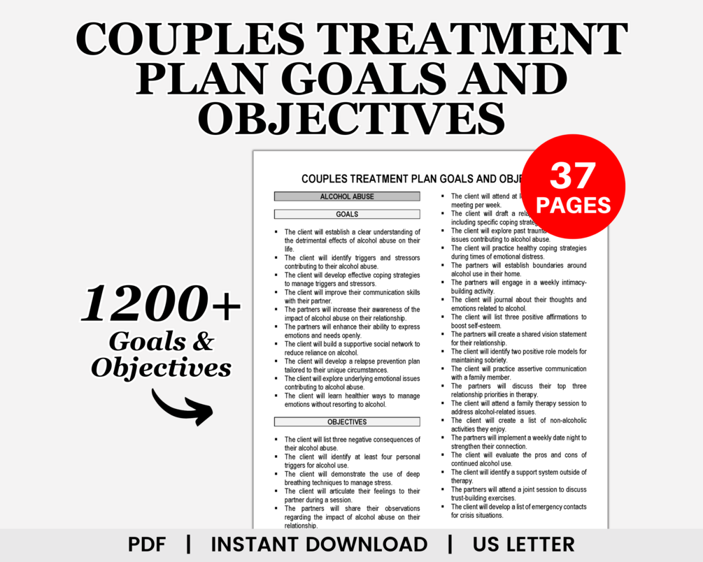Designed to empower your therapeutic journey, this comprehensive resource offers meticulously crafted couple treatment plan goals and objectives. Maximize your therapeutic impact with precision and ease. Each therapy goal and objective for couples is made to be adaptable, measurable, and client-centered, facilitating focused progress tracking and effective treatment planning.