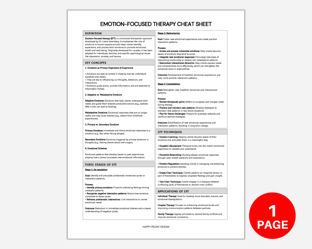 Ideal for therapists, counselors, and coaches looking to enhance their emotion-focused therapy (EFT) skills, this EFT cheat sheet offers concise, easy-to-reference techniques for engaging clients, exploring ambivalence, and fostering positive behavior change. Keep it handy during sessions for quick, effective guidance, empowering you to have more meaningful, empathetic dialogues that inspire progress.