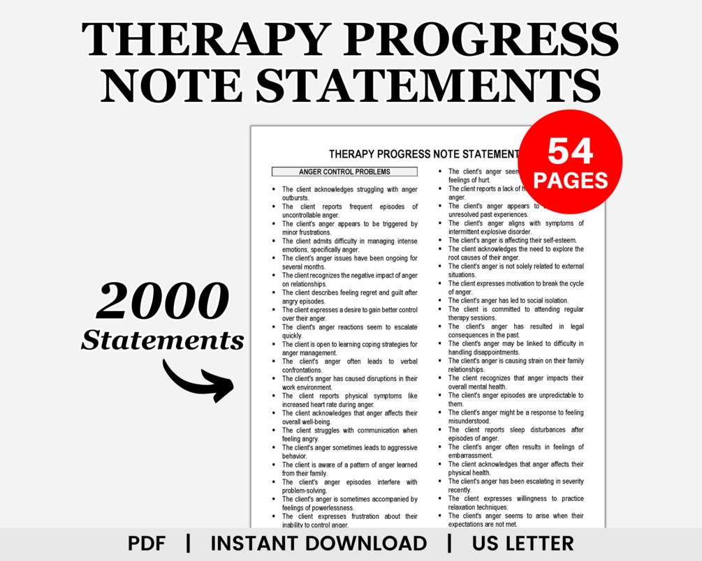 Designed to streamline and enhance your therapeutic practice, this comprehensive resource offers a collection of professionally made therapy progress note statements. Elevate your therapeutic sessions, improve client engagement, and manage your caseload with ease using this progress notes tool.